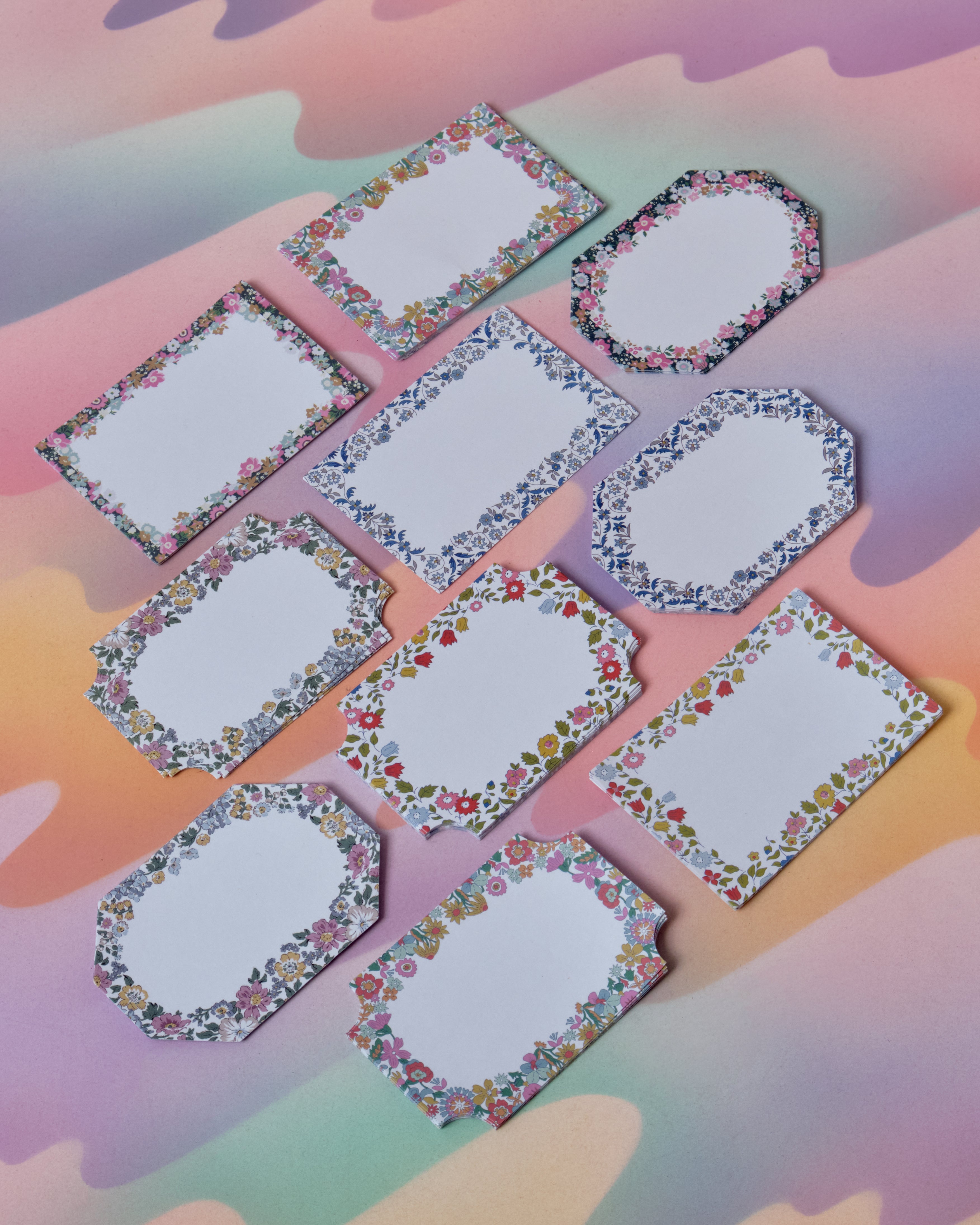 A tin of 72 adhesive labels with 12 distinct and uniquely shaped Liberty designs.
