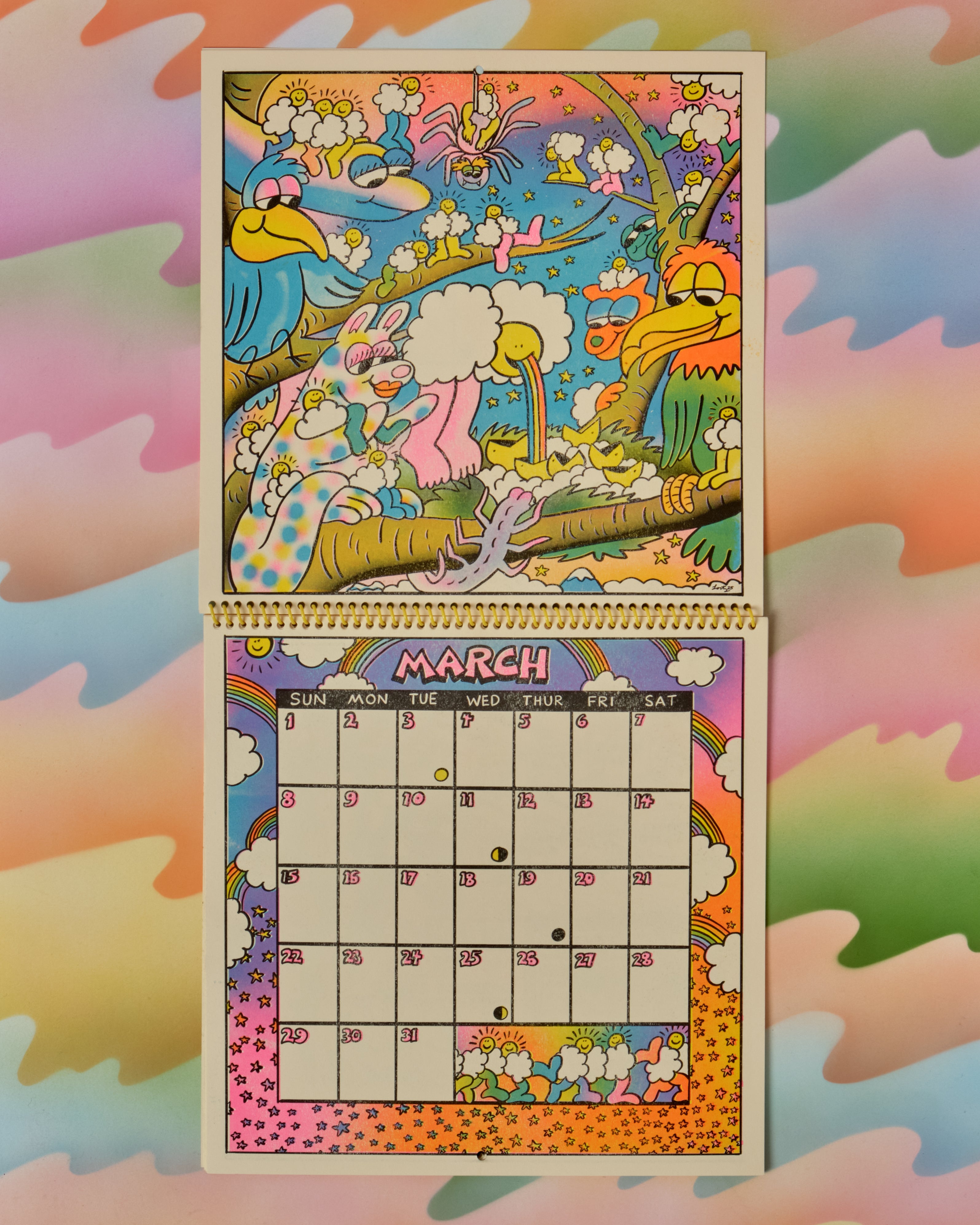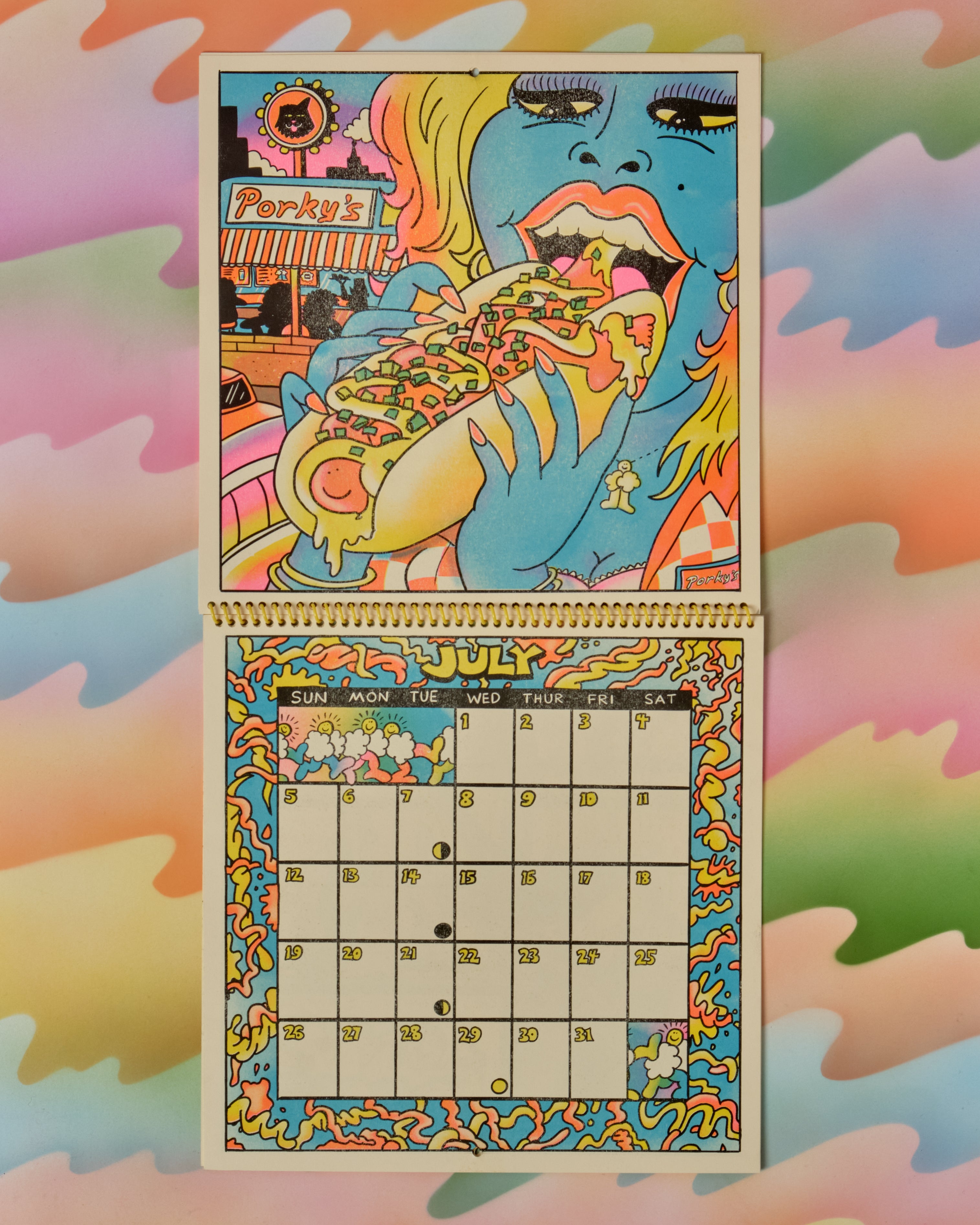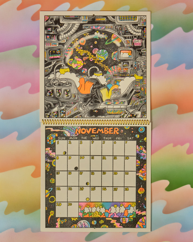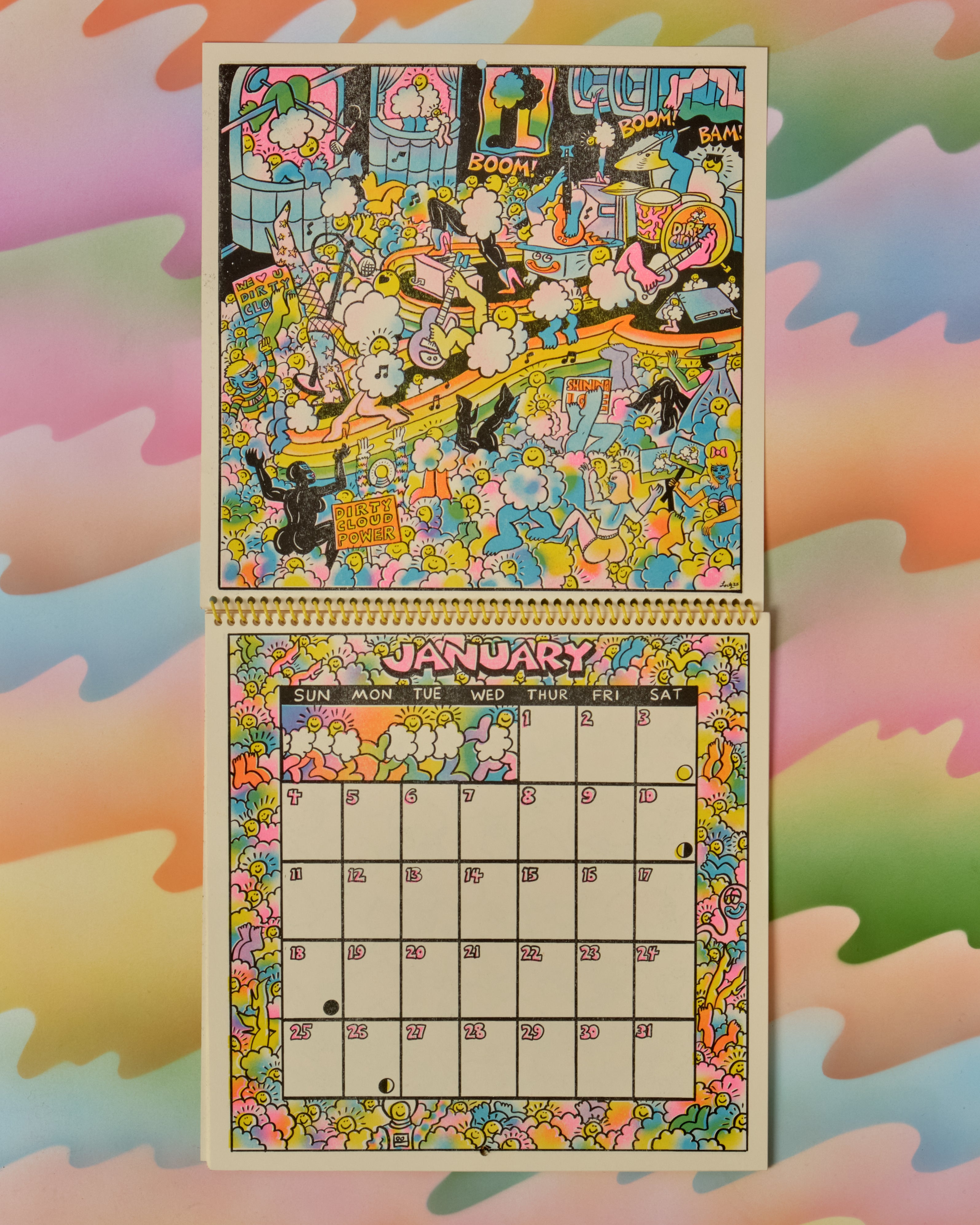 This calendar is 11 x 11 inches, riso printed, and coil bound.