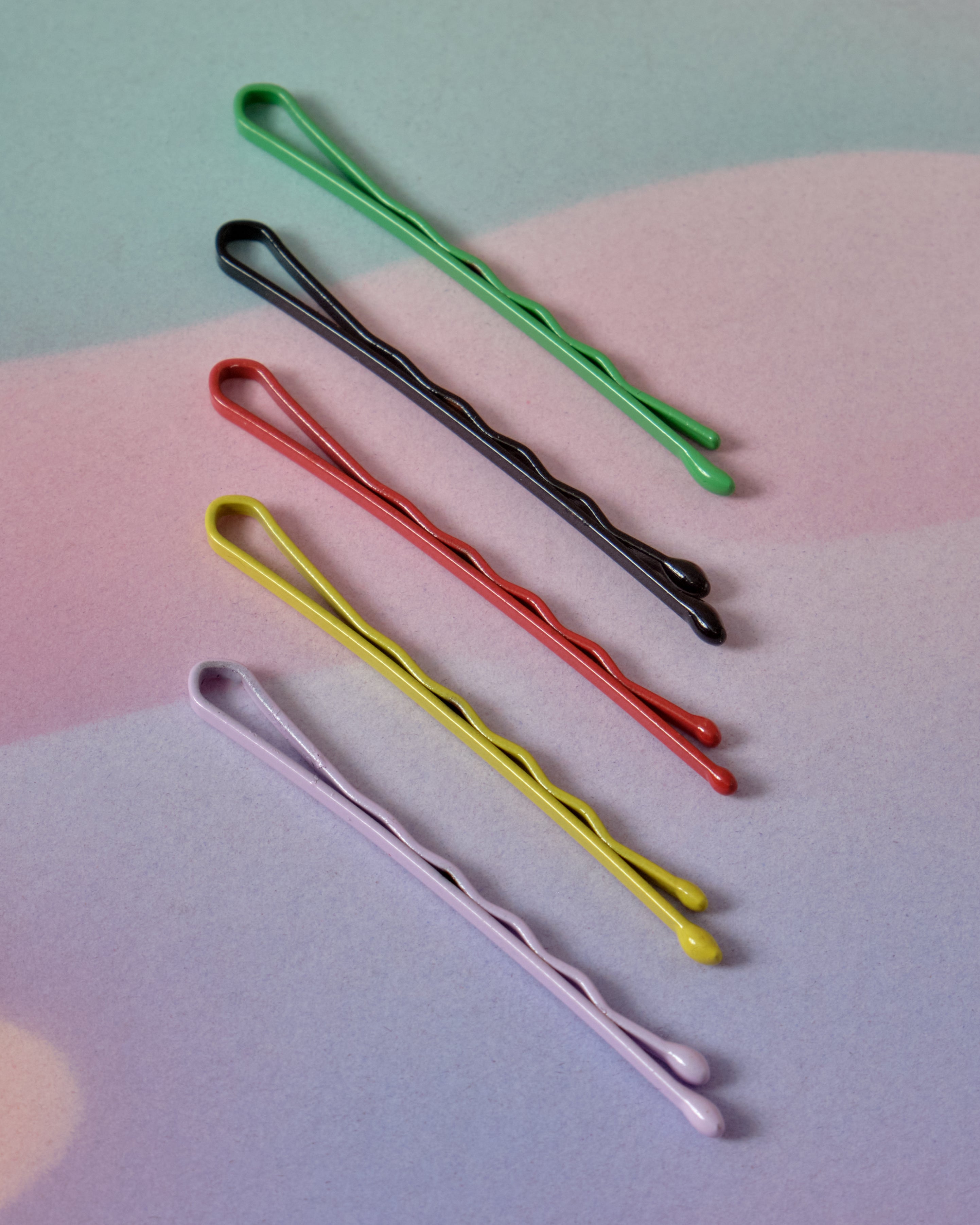A set of 30 multicolored, enamel coated bobby pins. Comes in a colorful, reusable metal tin.