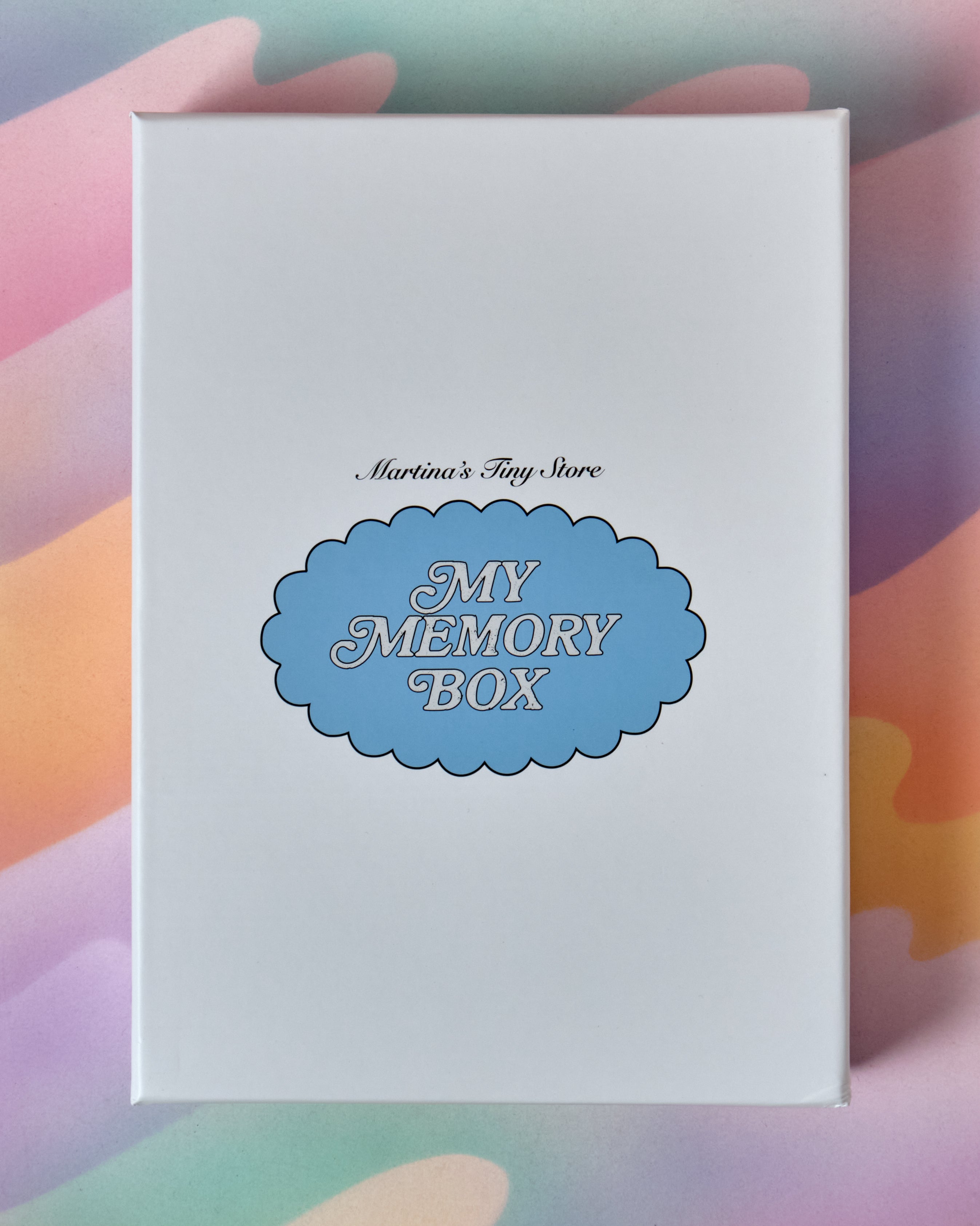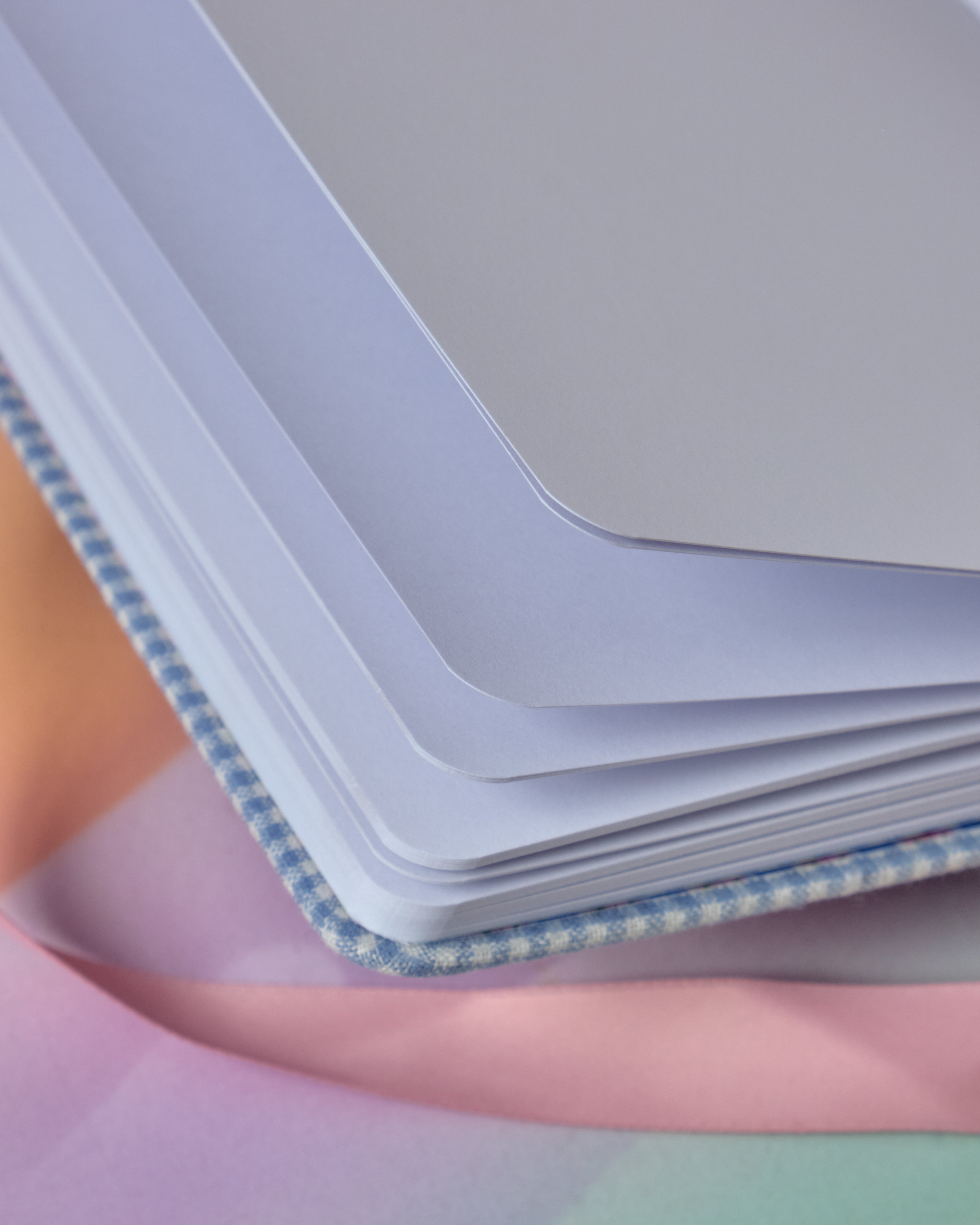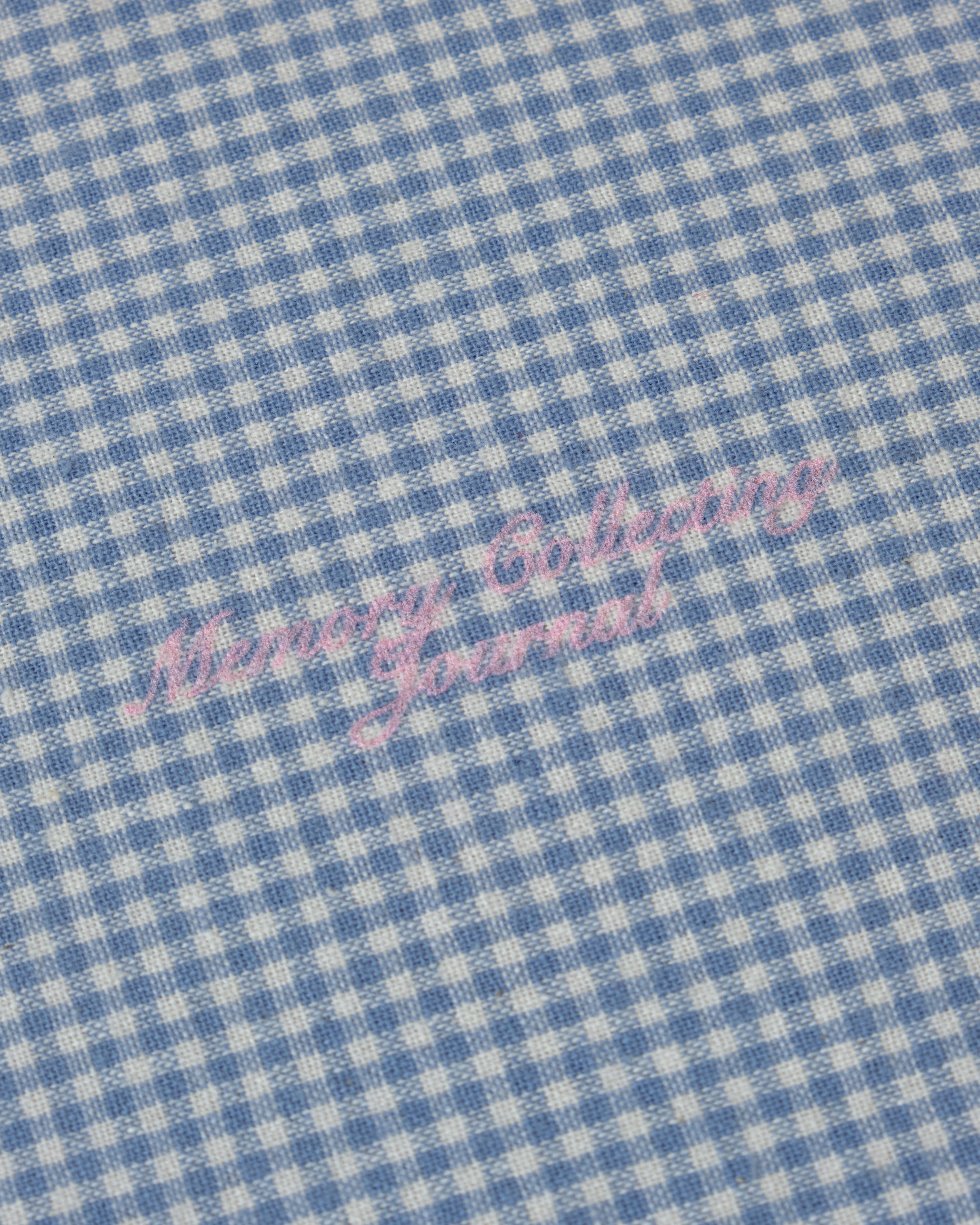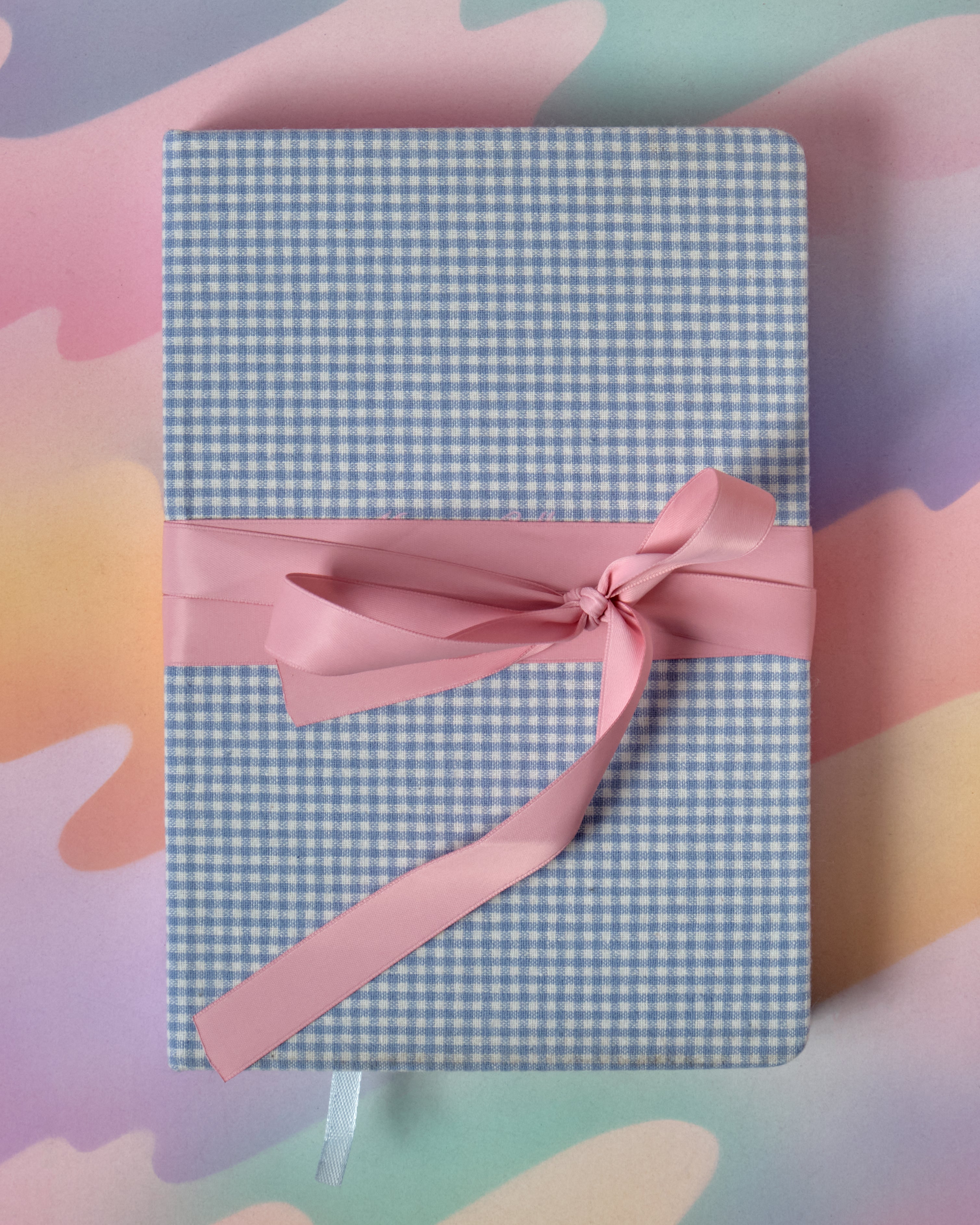 A baby blue gingham junk journal wrapped in a pink satin bow by Martina Calvi for TINYSTORE.