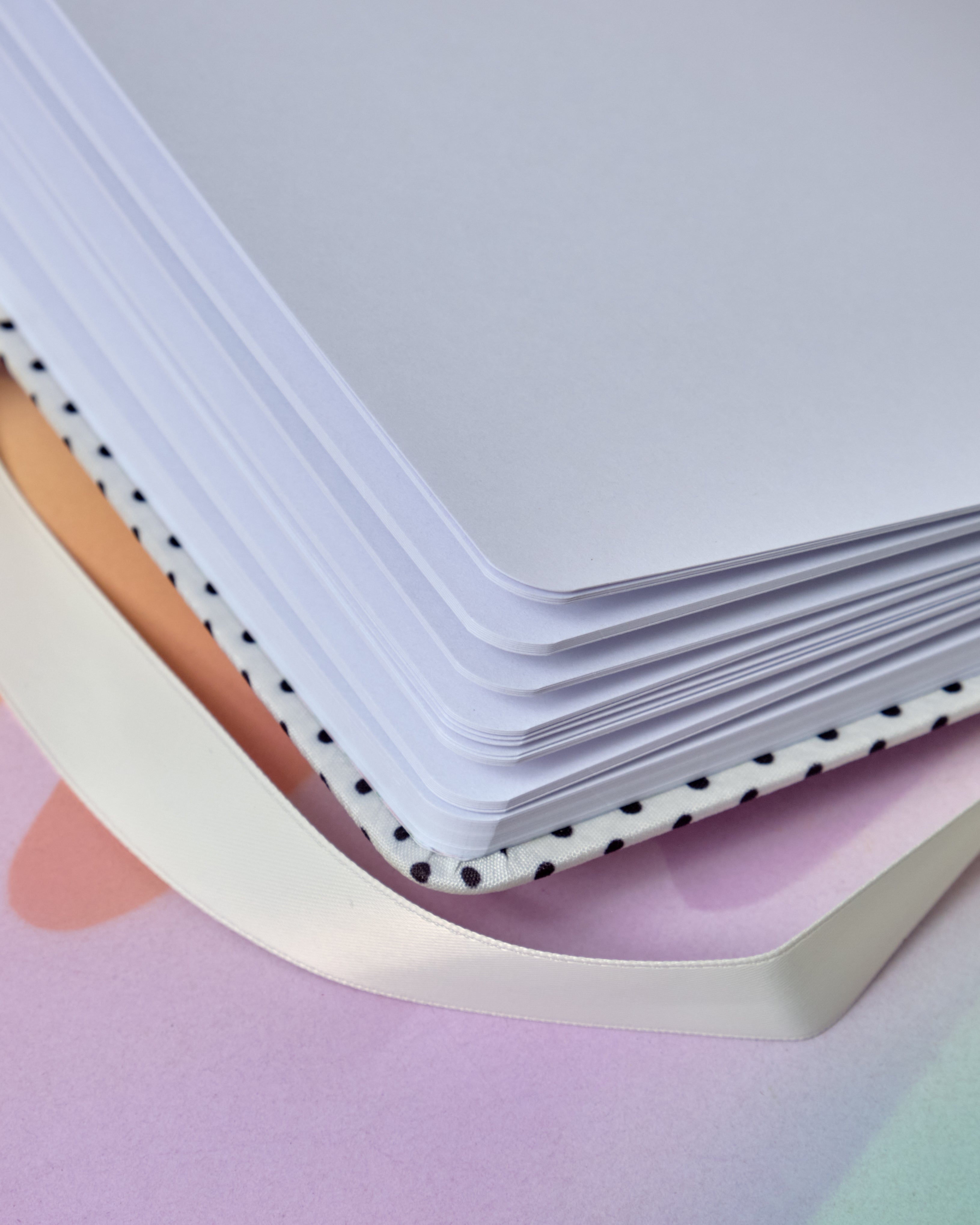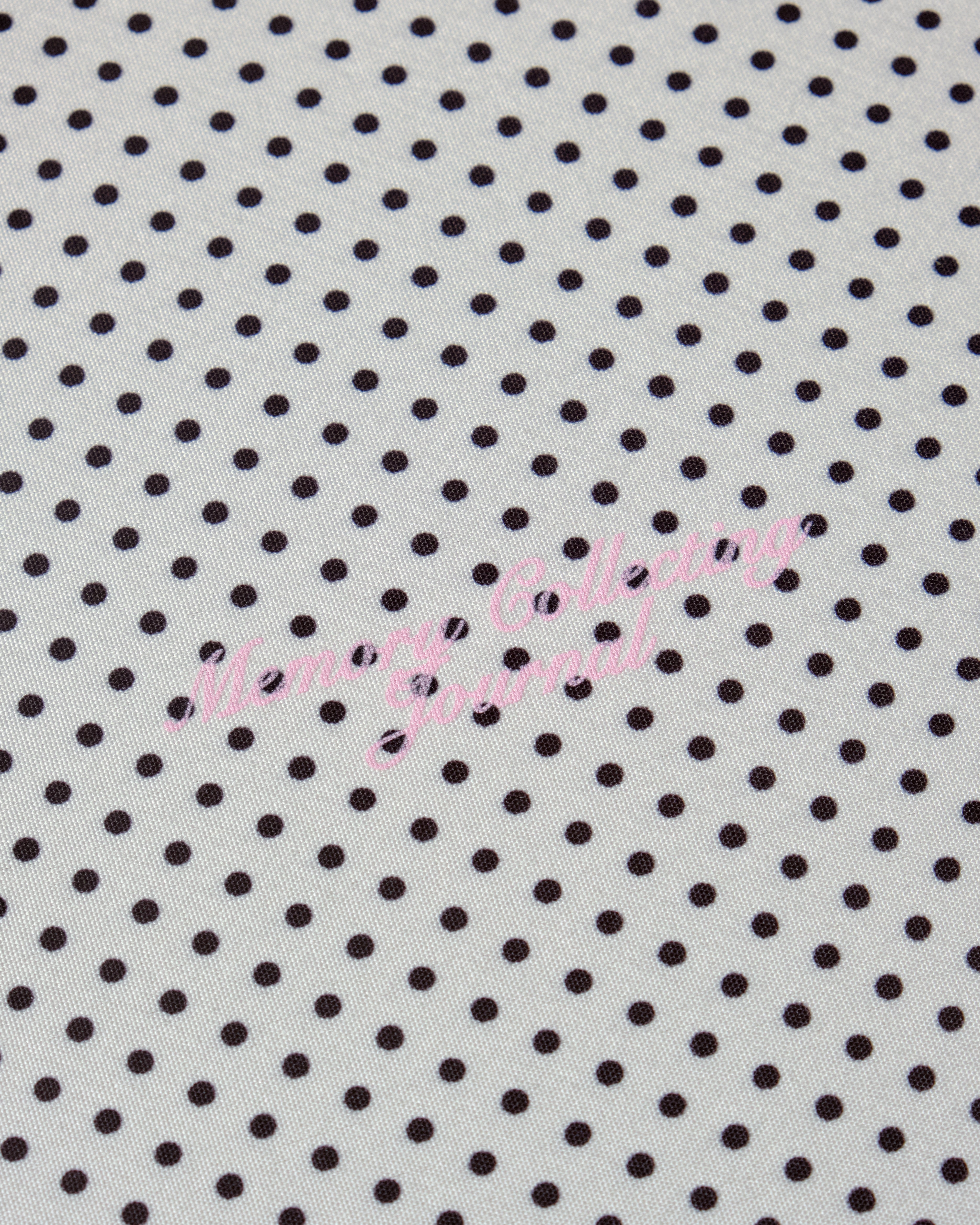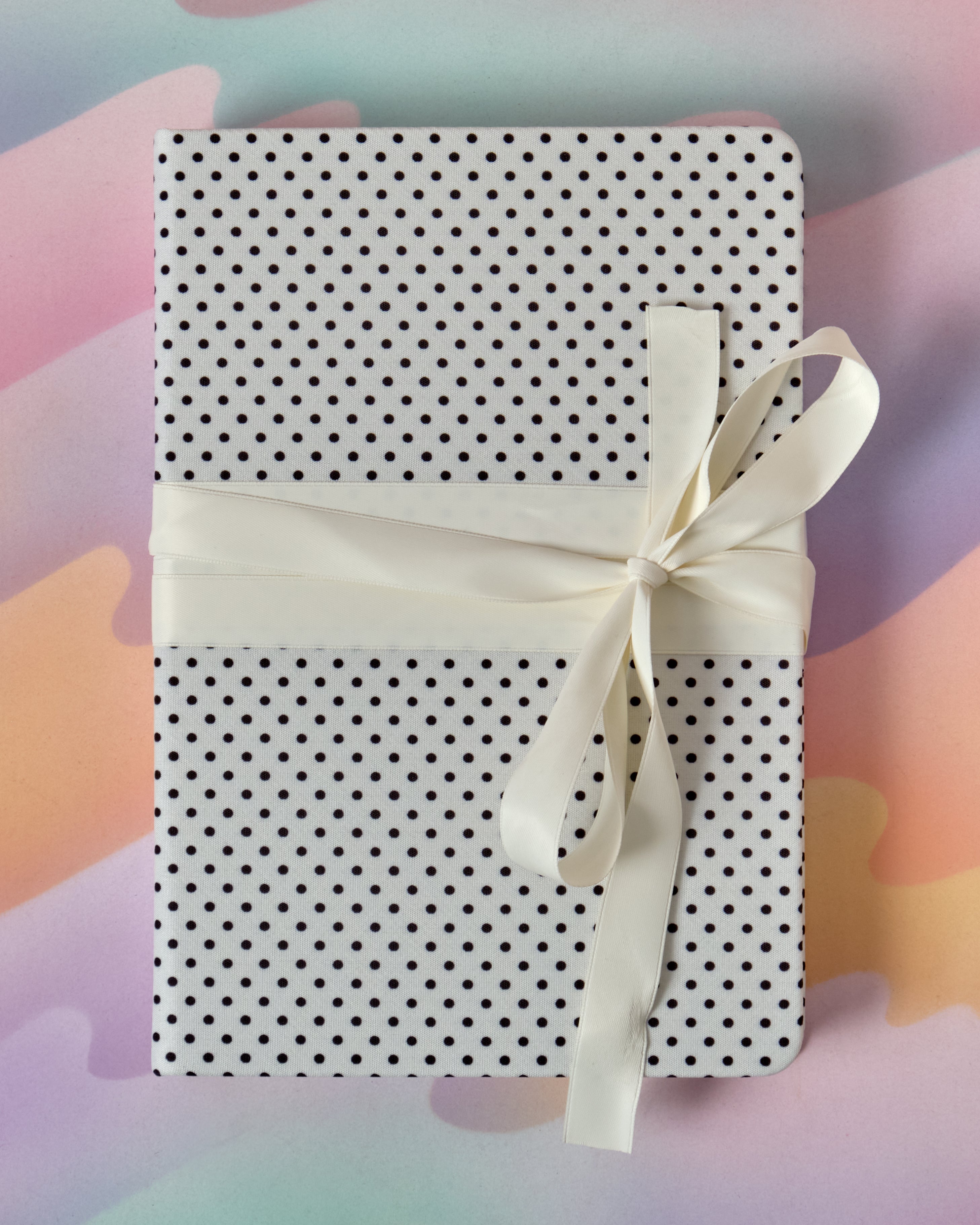 A black and white polka dot junk journal wrapped in a cream satin bow by Martina Calvi for TINYSTORE.