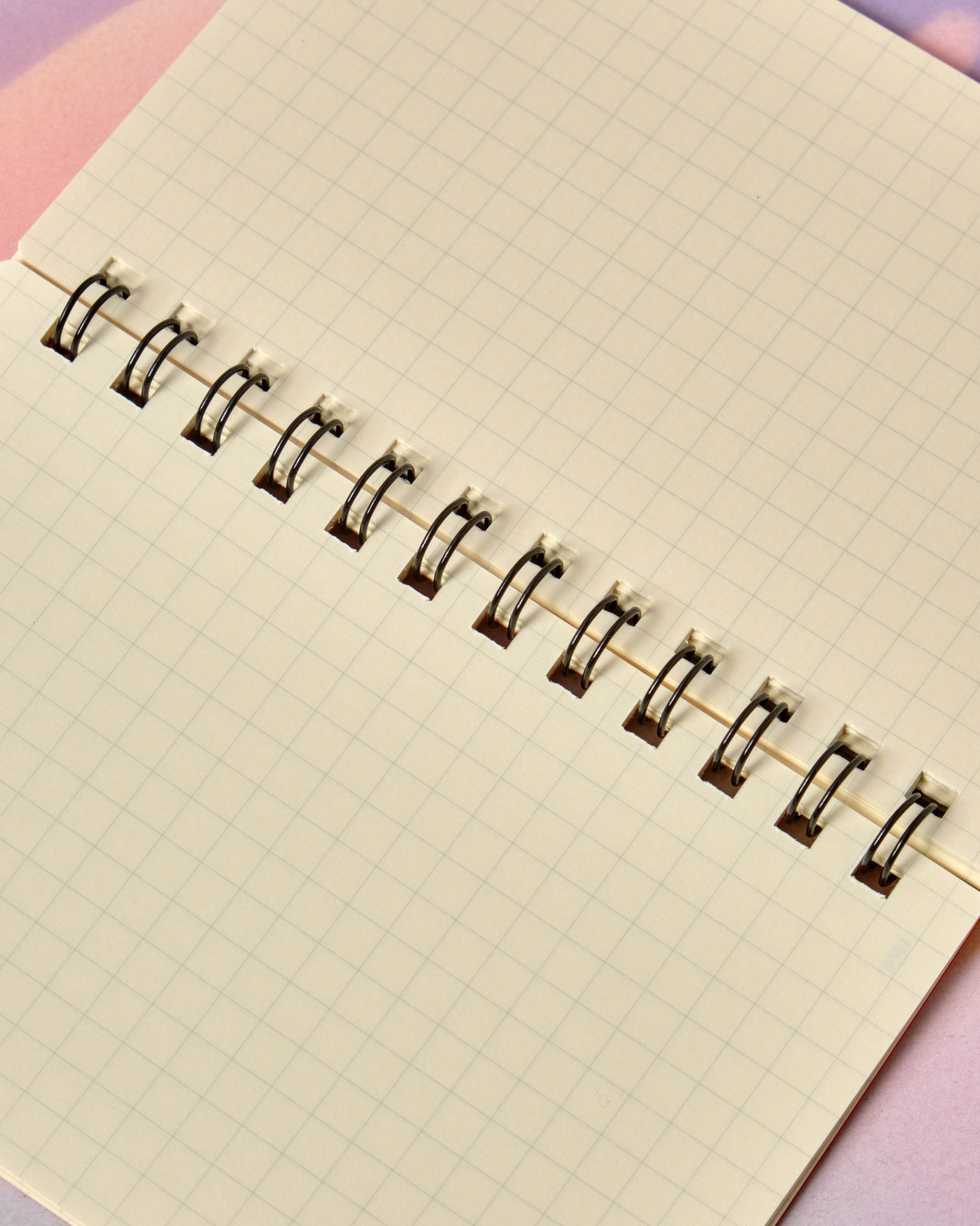 A spiral-bound notebook with cream-toned grid paper, perfect for note taking or sketching on the go. Includes 40 pages (20 sheets) and measures 3 x 5 inches.