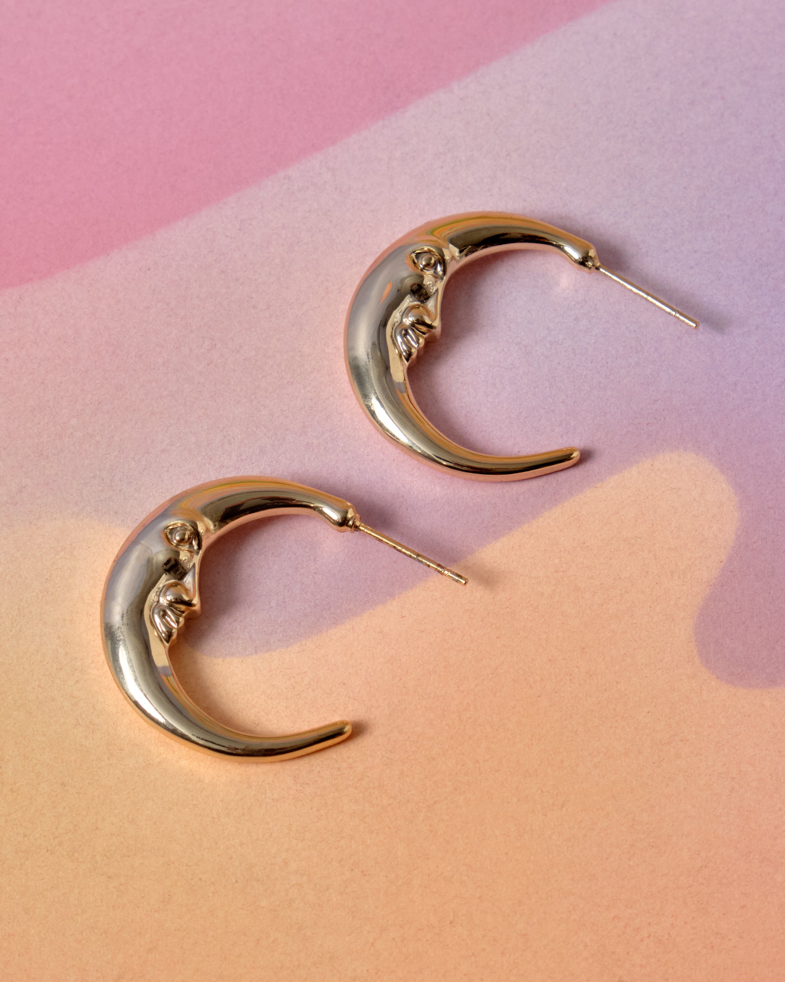 Shiny gold crescent moon hoops from Los Angeles based brand, Peter and June.