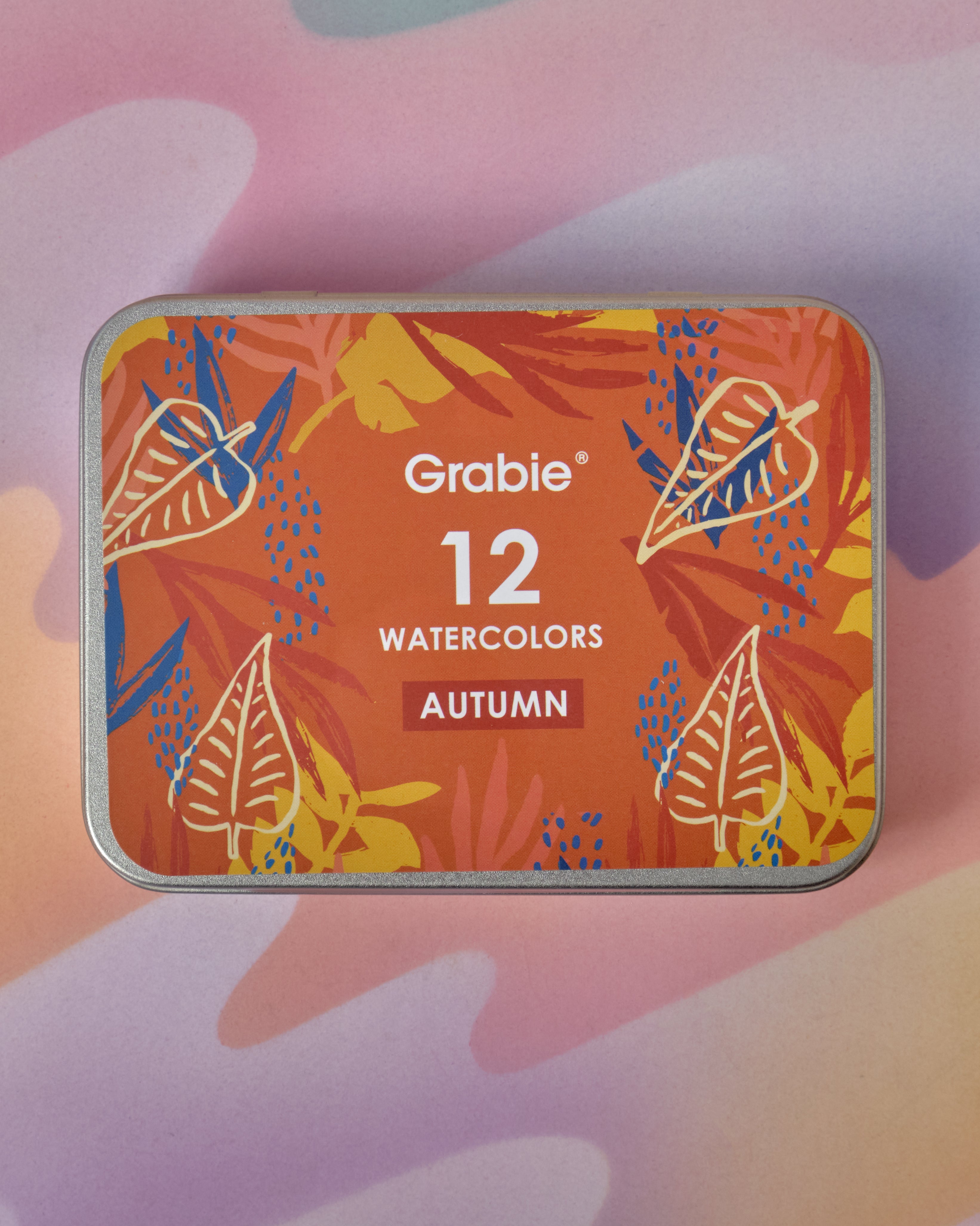 A pocket watercolor set by Grabie! This set features 12 vibrant watercolor paints, a water brush pen for blending, a sponge for cleaning, 4 premium 140lb (300gsm) watercolor sheets, and a swatch sheet for quick color references.
