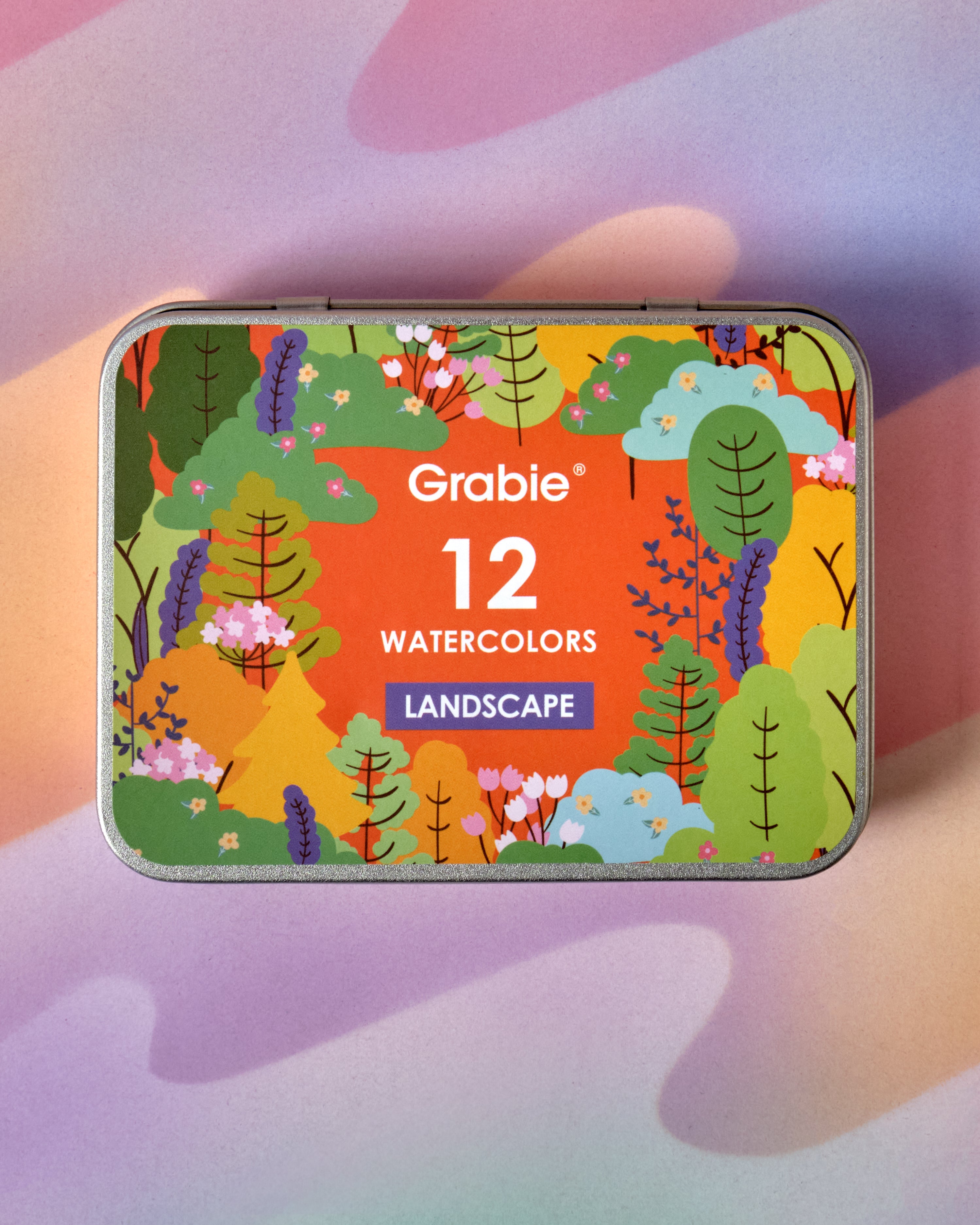 A pocket watercolor set by Grabie! This set features 12 vibrant watercolor paints, a water brush pen for blending, a sponge for cleaning, 4 premium 140lb (300gsm) watercolor sheets, and a swatch sheet for quick color references.