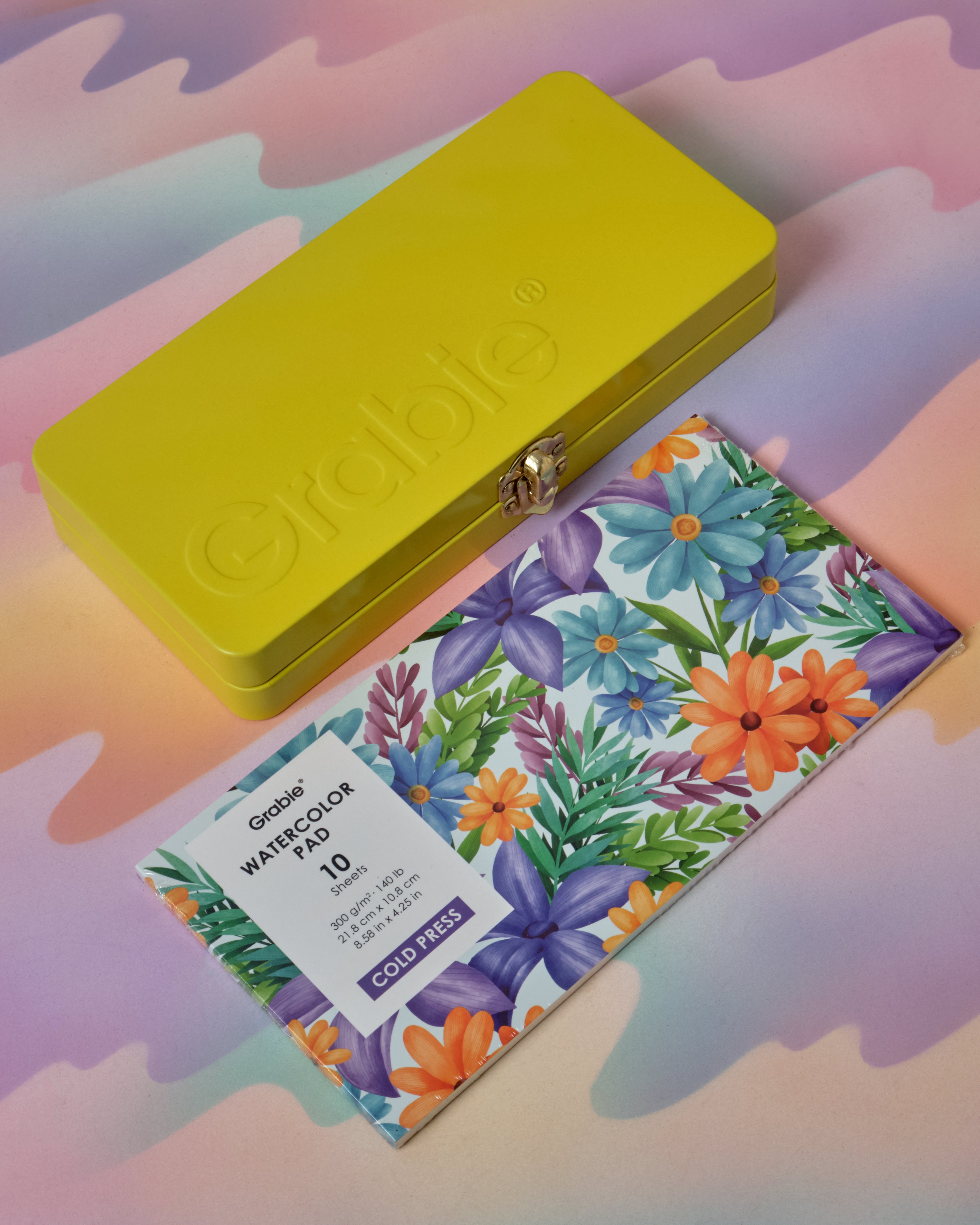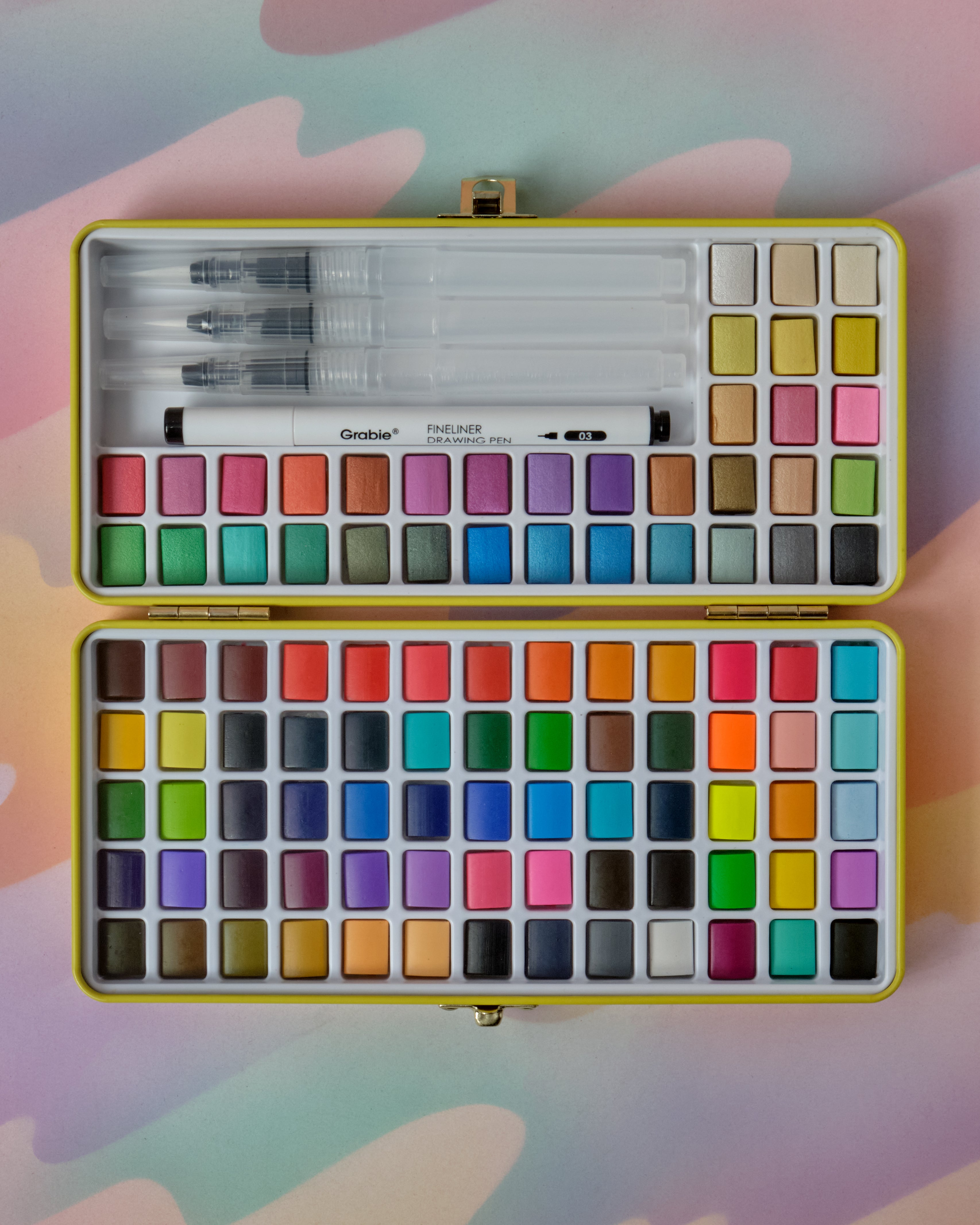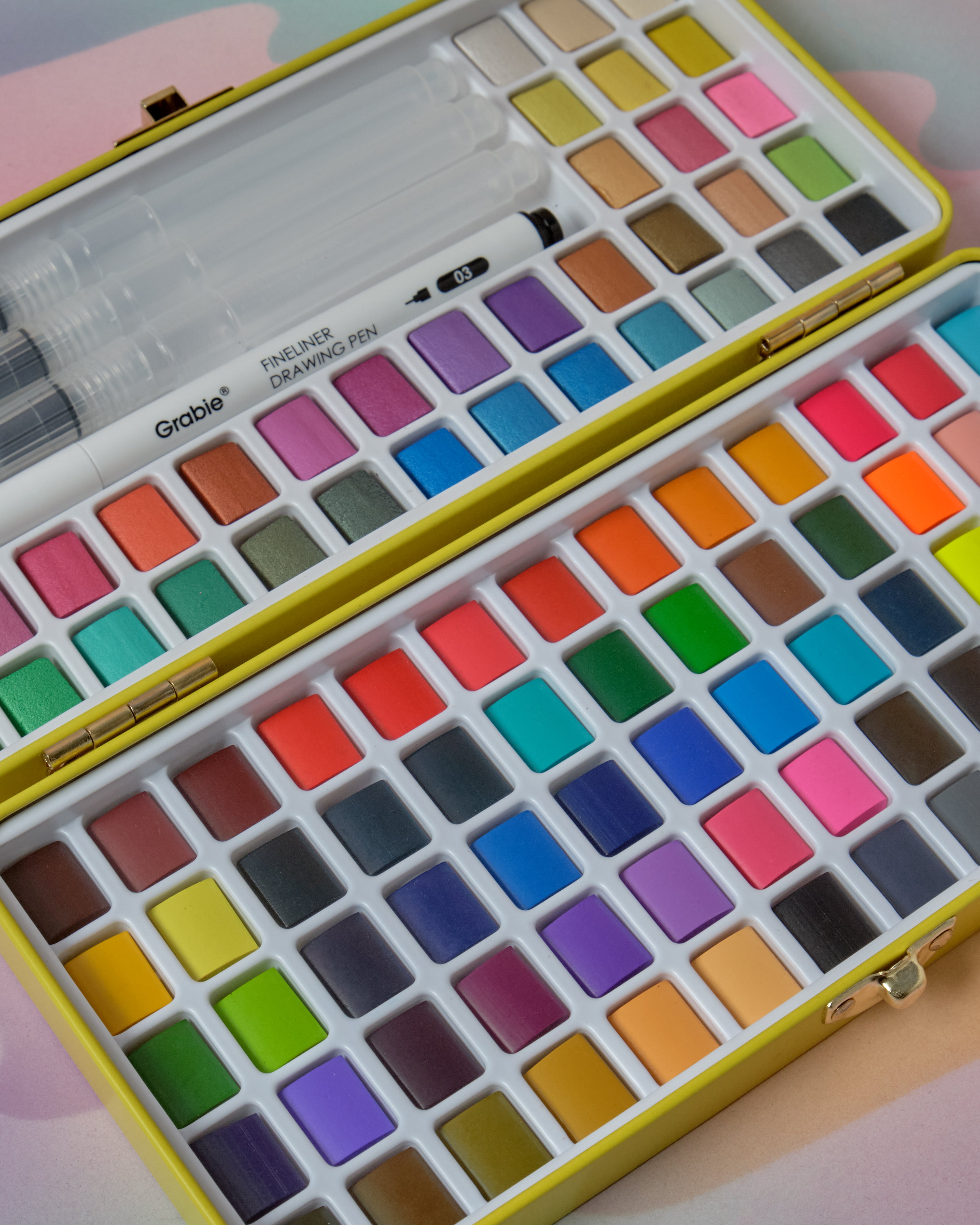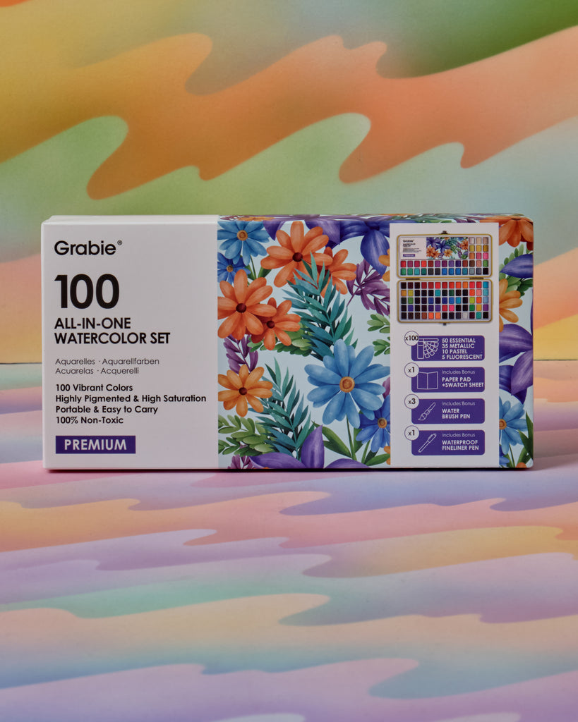 An all in one watercolor set by Grabie! This set features 100 vibrant watercolor paints, 1 waterproof fineliner pen, 3 various water brush pens, a swatch sheet, cleaning sponge, and 10 sheets of premium 140lb (300gsm) watercolor sheets.